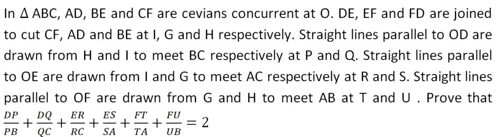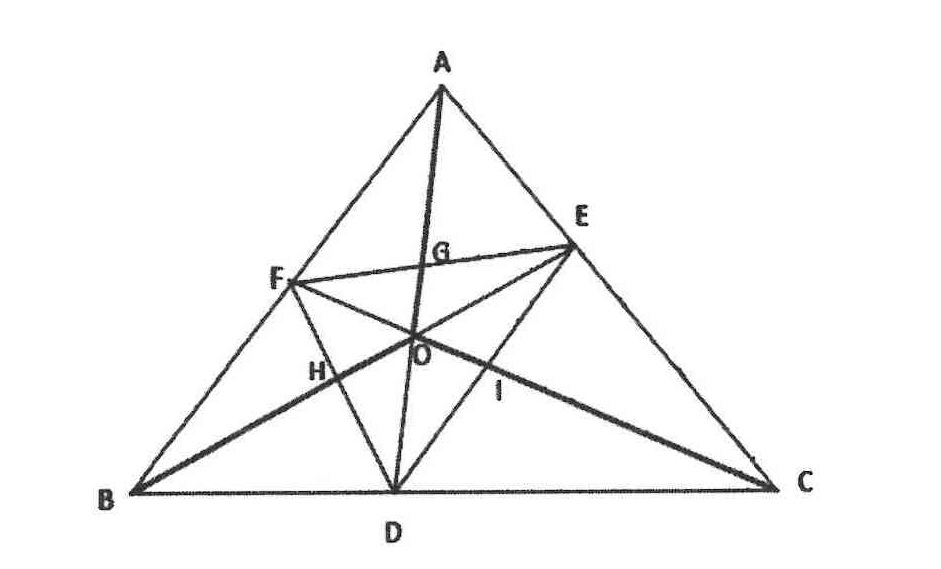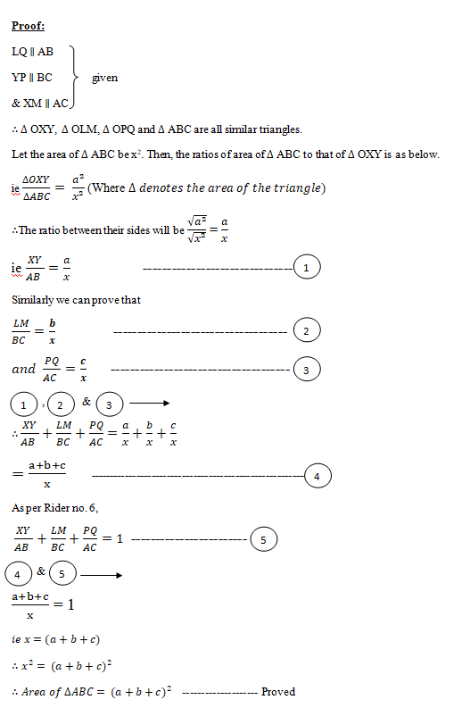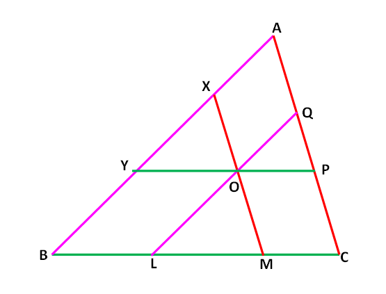 In the adjoining figure, the lines LQ, YP and XM have been drawn parallel to the sides AB, BC and AC respectively through the point ‘O’ lying inside ΔABC. If the areas of Δ OXY , Δ OLM and Δ OPQ are a
